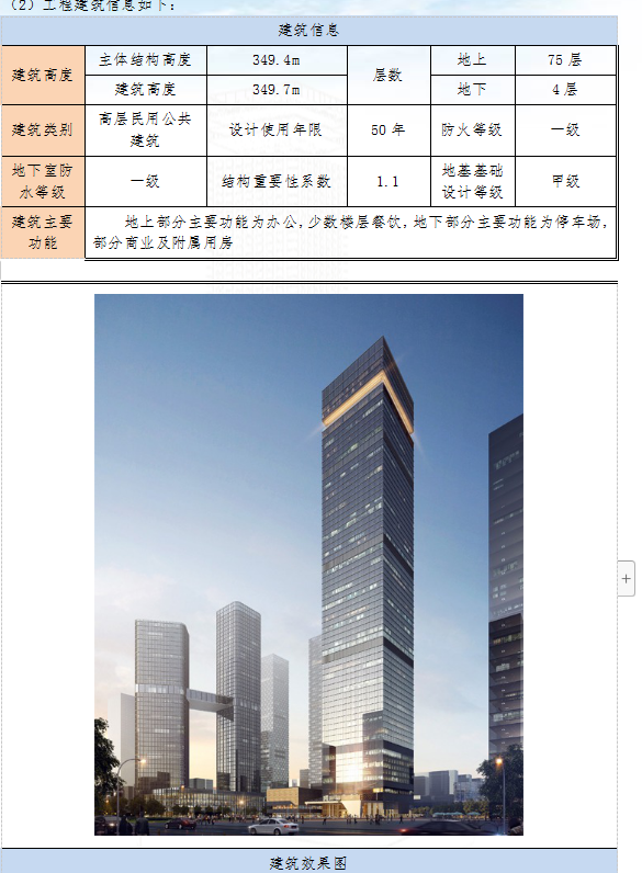 建筑功能地上部分主要为办公,少数楼层餐饮,地下部分主要为停车场,部分商业及附属用房,结构形式主楼采用框架核心筒混合结构,裙房采用框架剪力墙结构,主楼楼板采用钢筋桁架楼承板,裙房采用现浇混凝土楼板。主楼地上75层,裙房地上3层,地下4层,建筑高度349.7m,结构高度为349.4m,总建筑面积为289978m2。