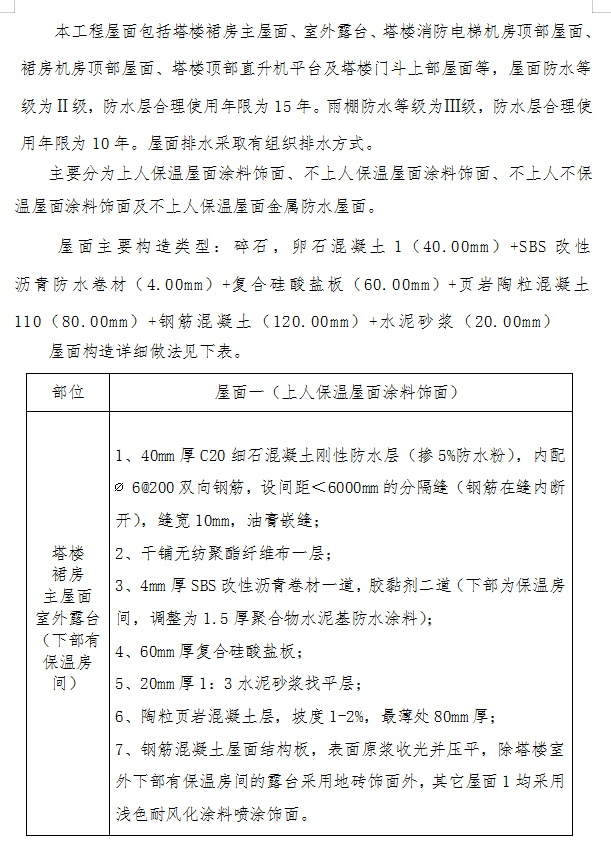 本工程屋面包括塔楼裙房主屋面、室外露台、塔楼消防电梯机房顶部屋面、裙房机房顶部屋面、塔楼顶部直升机平台及塔楼门斗上部屋面等,屋面防水等级为Ⅱ级,防水层合理使用年限为15年。雨棚防水等级为Ⅲ级,防水层合理使用年限为10年。屋面排水采取有组织排水方式。