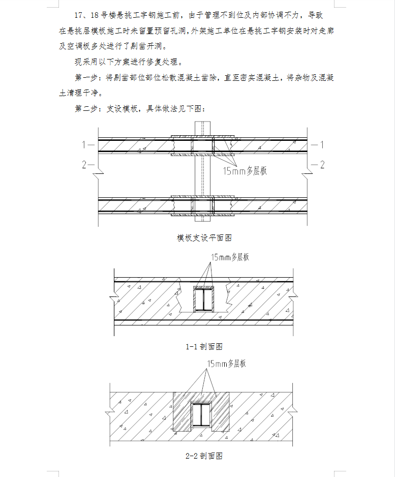 将剔凿部位部位松散混凝土凿除,直至密实混凝土,将杂物及混凝土清理干净。模板支设完成后,浇水湿润,用强度等级高一标号C35微膨胀细石混凝土仔细分层浇筑,捣实密实,并浇水养护7天后拆除模板。下面支撑体系待混凝土强度达到100%强度后再进行拆除。