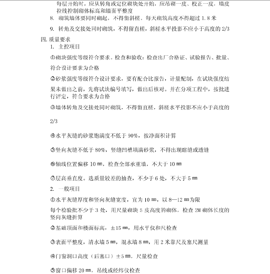 墙体放线、红砖浇水(提前1天至2天)一-制备砂浆-砌块排列- -铺砂浆-砌块就位一-校正一竖缝灌沙浆- -勒缝。