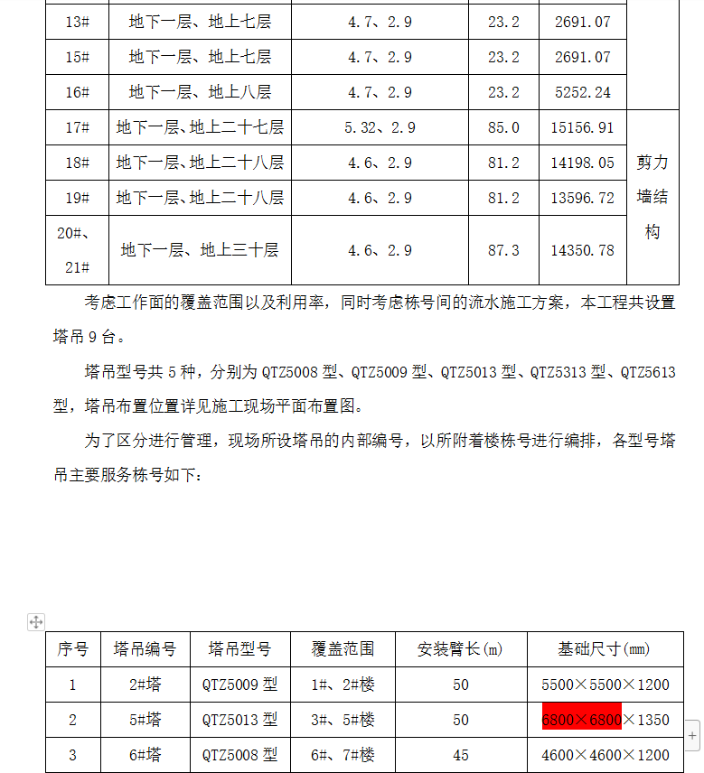 考虑工作面的覆盖范围以及利用率,同时考虑栋号间的流水施工方案,本工程共设置塔吊9台。
