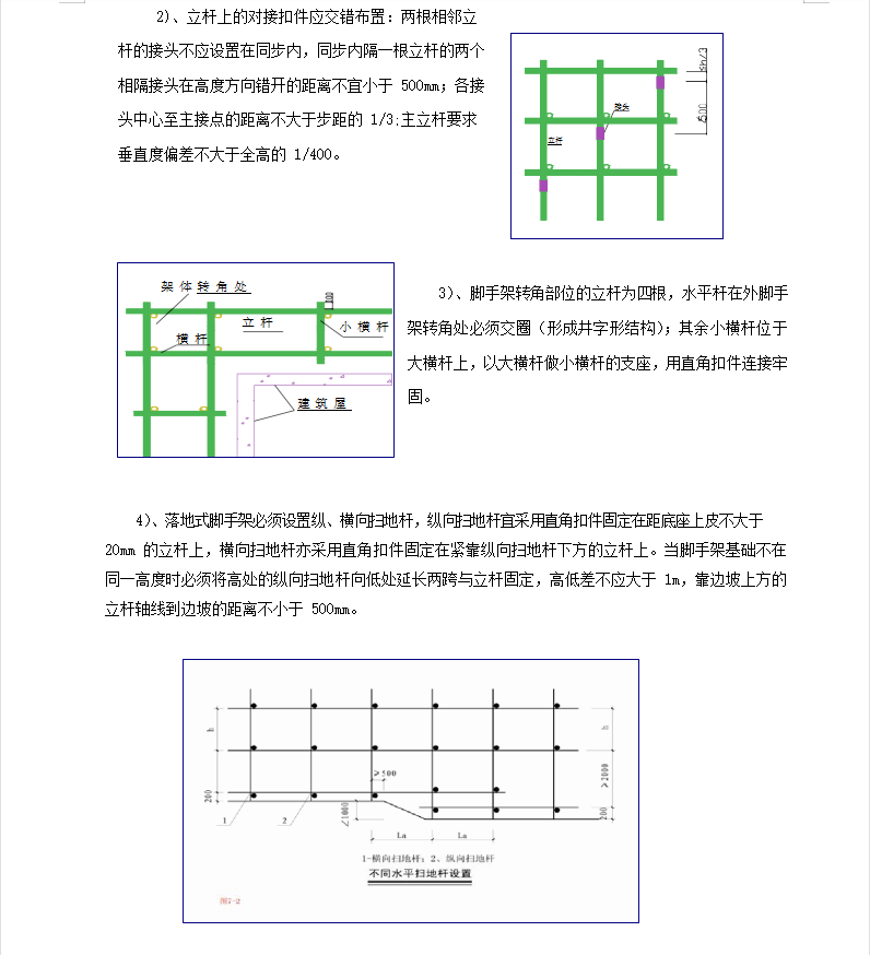 脚手架是为建筑施工而搭设的上料、堆料与施工作业用的临时结构架。更重要的是为我们提供安全的行走平台,主要承担从主体结构到后期装修装饰整个施工全过程的围护架。外架采用¢48×3.5 钢管搭设,排距不小于 800 ㎜,纵距不大于 1500 ㎜(根据方案确定),步距为1800mm。根据使用模板材料的不同,立杆与建筑物之间的距离为:一般模板:剪力墙处:内立杆距墙 200 ㎜以内,有阳台处内立杆距阳台板 250 ㎜;外立杆距墙 1100㎜;大模板、钢模:内立杆距墙 400 ㎜以内。