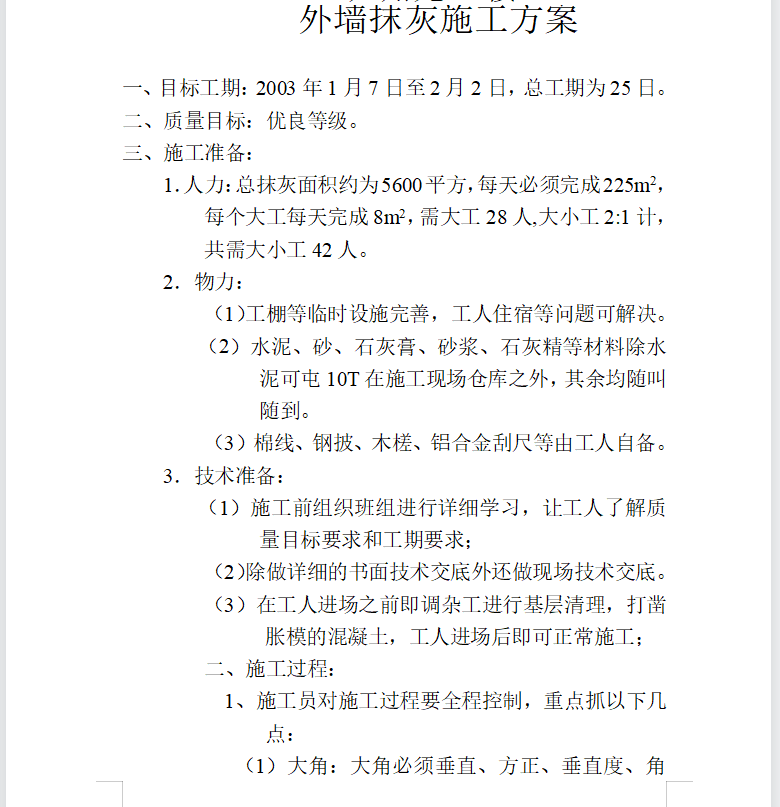 人力:总抹灰面积约为5600平方,每天必须完成225m2,每个大工每天完成8m2,需大工28人,大小工2:1计,共需大小工42人。
