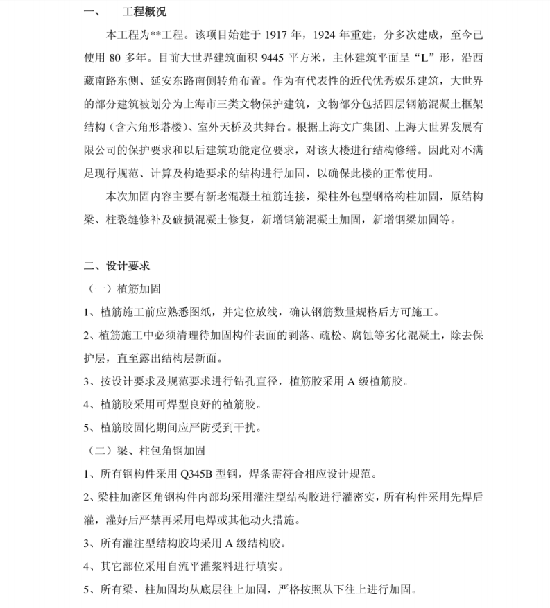 ±¾¹¤³ÌΪ**¹¤³Ì¡£¸ÃÏîĿʼ½¨ÓÚ1917Ä꣬1924 ÄêÖØ½¨£¬·Ö¶à´Î½¨³É£¬ÖÁ½ñÒÑʹÓÃ80¶àÄꡣĿǰ´óÊÀ½ç½¨ÖþÃæ»ý9445ƽ·½Ã×£¬Ö÷Ì彨ÖþÆ½Ãæ³Ê¡°L¡±ÐΣ¬ÑØxxx·¶«²à¡¢xxx·Äϲàת½Ç²¼Öá£×÷ΪÓдú±íÐԵĽü´úÓÅÐãÓéÀÖ½¨Öþ£¬´óÊÀ½çµÄ²¿·Ö½¨Öþ±»»®·ÖΪÉϺ£ÊÐÈýÀàÎÄÎï±£»¤½¨Öþ£¬ÎÄÎﲿ·Ö°üÀ¨ËIJã¸Ö½î»ìÄýÍÁ¿ò¼Ü½á¹¹(º¬Áù½ÇÐÎËþÂ¥)¡¢ÊÒÍâÌìÇż°¹²Îę̀¡£