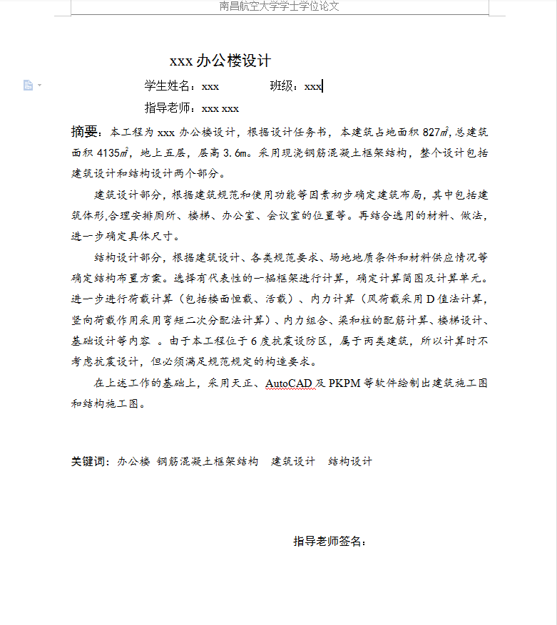 本工程为xxx办公楼设计,根据设计任务书,本建筑占地面积827m2,总建筑面积4135m2,地上五层,层高3.6m。采用现浇钢筋混凝土框架结构,整个设计包括建筑设计和结构设计两个部分。