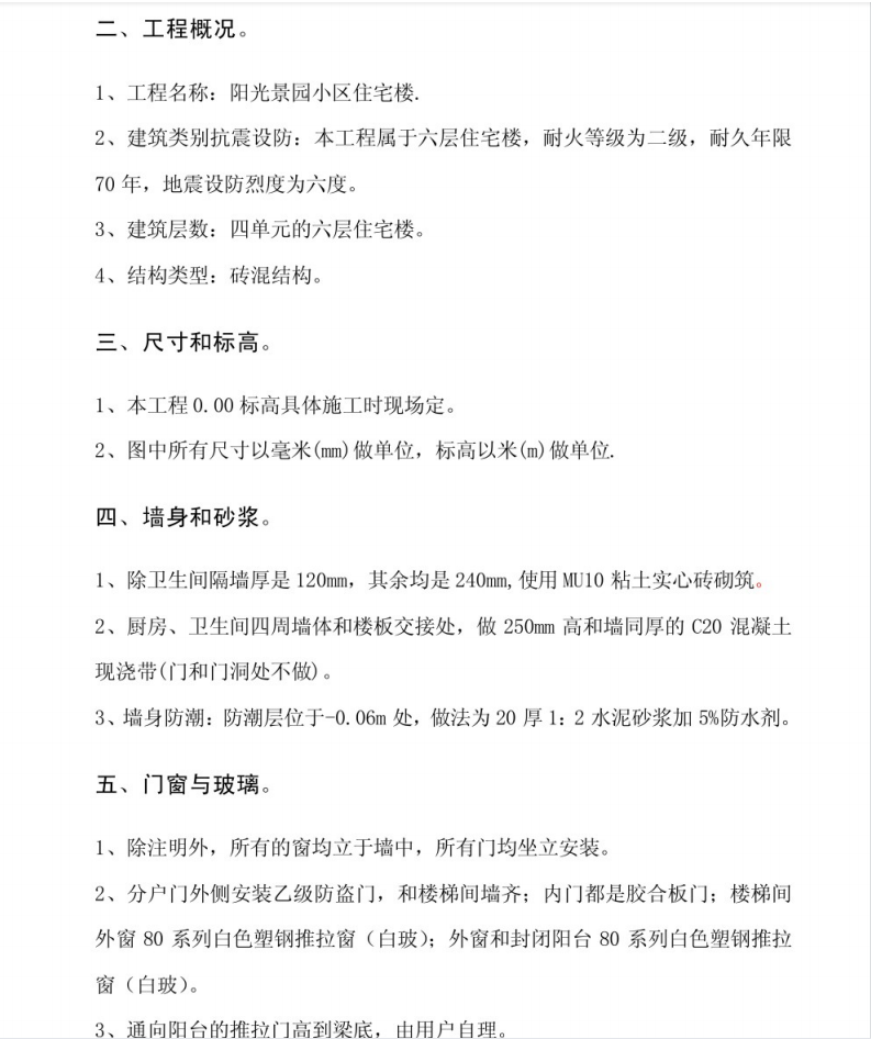 本工程建筑类别抗震设防:本工程属于六层住宅楼,耐火等级为二级,耐久年限70年,地震设防烈度为六度。建筑层数:四单元的六层住宅楼。结构类型:砖混结构。除卫生间隔墙厚是120mm,其余均是240mm,使用MU10粘土实心砖砌筑。厨房、卫生间四周墙体和楼板交接处,做250mm高和墙同厚的C20混凝土现浇带(门和门]洞处不做)。