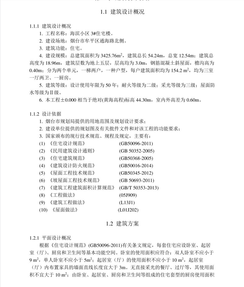 本工程总建筑面积为3425.76m2,建筑总长54.24m,总宽12.54m;建筑总高度为18.96m,建筑层数为地上五层,层高均为3.0m,钢筋混凝土斜屋面,檐沟高为0.40m;分为两个单元,一梯两户,一种户型,每户建筑面积均为154.2m2,均为三室一厅两卫、一厨房。建筑等级:设计使用年限为50年;耐火等级为二级;采光等级为三级;屋面防水等级为II级。