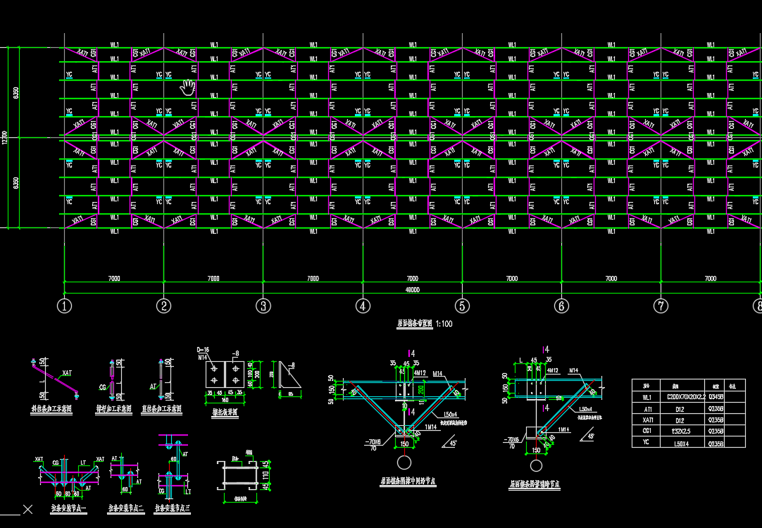 门式钢架施工图纸包括基础平面布置图、基础详图、地脚锚栓布置图、刚架及支撑布置图、屋面檩条布置图、墙面檩条布置图、柱间支撑布置图