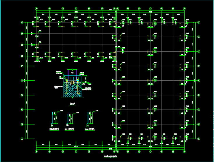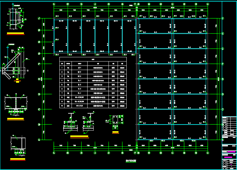 L型门式刚架结构厂房结构施工图包括:预埋螺栓平面布置图、结构平面布置图、梁柱平面布置图、轴柱间支撑布置图、屋面檩条布置图、轴墙面檩条布置图等。