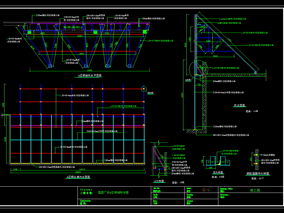 某百货商场屋面广告牌结构施工图纸包括屋面广告钢结构总平面图、屋面广告牌上操作通道详图、广告牌总平、立面图、广告牌立面详图、照明灯具线路布置图、包铝塑板平、立、剖面详图、钢结构详图等,供大家参考!