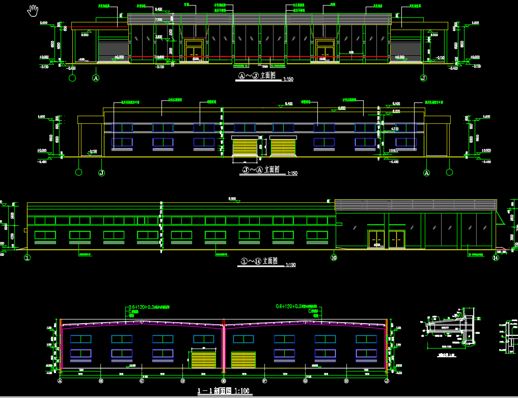 某4S店建筑结构设计图纸包括柱脚锚栓布置图、屋面檩条平面布置图、屋面结构平面布置图、线墙架布置图、展厅正立面图、屋顶平面图、二层组合平面图、一层组合平面图