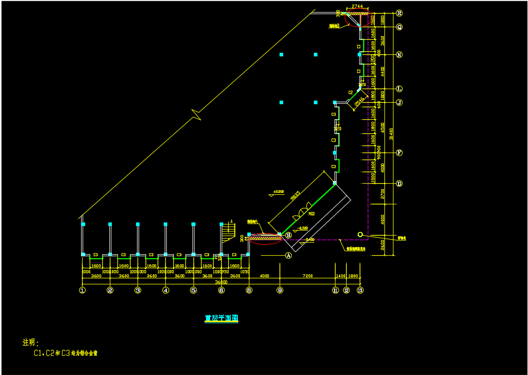 某建筑铝塑板外立面幕墙布置图包括;首层平面图、二层平面图、屋面平面图、屋面钢结构平面图、立面图、C3立面展开图、钢结构A平面图。
