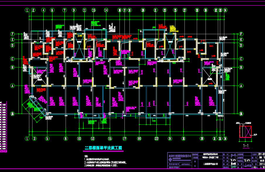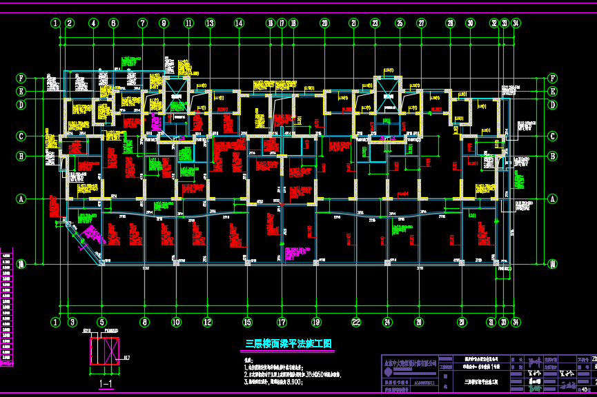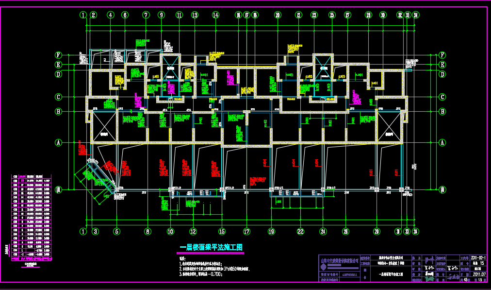 本工程地下一层为储藏室,地上十七层,一~二层为商业,三~十七层为住宅,室内外高差为 0.300m,屋面标高为 54.000m。东西长 46.8m,南北宽 14.8m。裙房地上两层均为商业。±0.000对应的绝对标高为 89.600m。地下一层剪力墙平面布置图,裙房框架柱平面布置图,二层墙体结构施工图,三~十五层墙体结构施工图,十六层墙体结构施工图,十七层墙体结构施工图,二层楼面板施工图,十六层楼面板施工图,核心筒楼梯施工图等