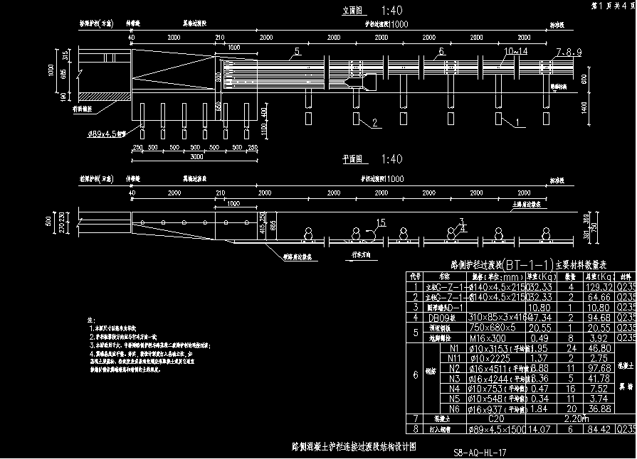 本文件为护栏结构设计详细图纸,包括:护栏设计图、路侧混凝土护栏连接过渡段结构设计图、中央混凝土护栏连接过渡结构设计图、护栏板结构设计图、防阻块结构设计图、护栏混凝土基础设计图、圆形端头结构设计图等