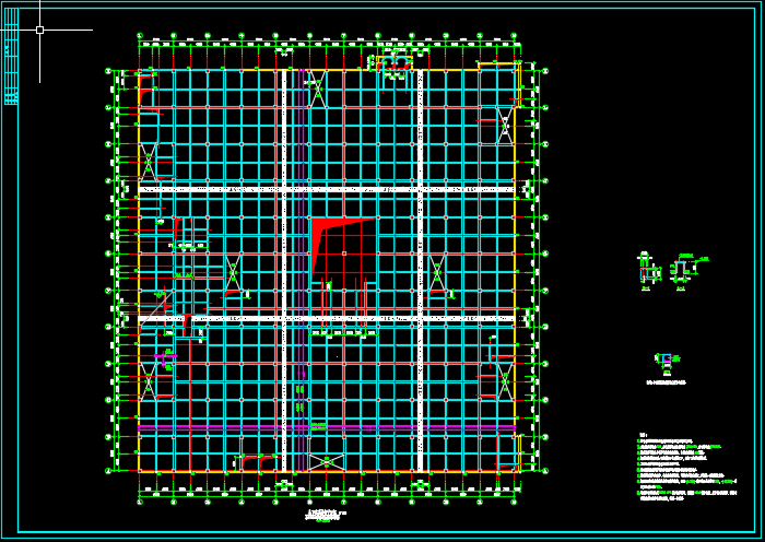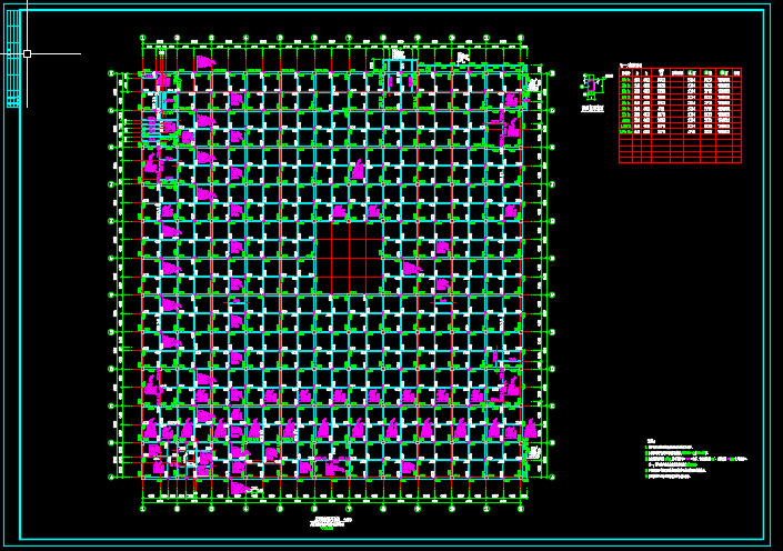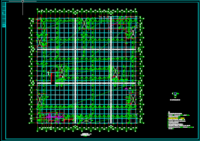 某大型商城混凝土结构施工图纸包括柱网平面图、基础平面图、三层顶结构平面图、地下室顶结构平面图、三层顶梁配筋平面图、地下室顶梁配筋平面图、一层顶梁配筋平面图、二层顶梁配筋平面图、塔楼及构架梁配筋平面图、二层顶结构平面图、塔楼及构架结构平面图