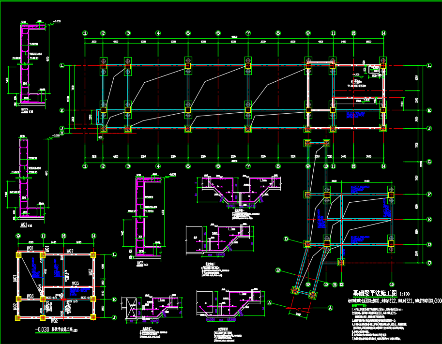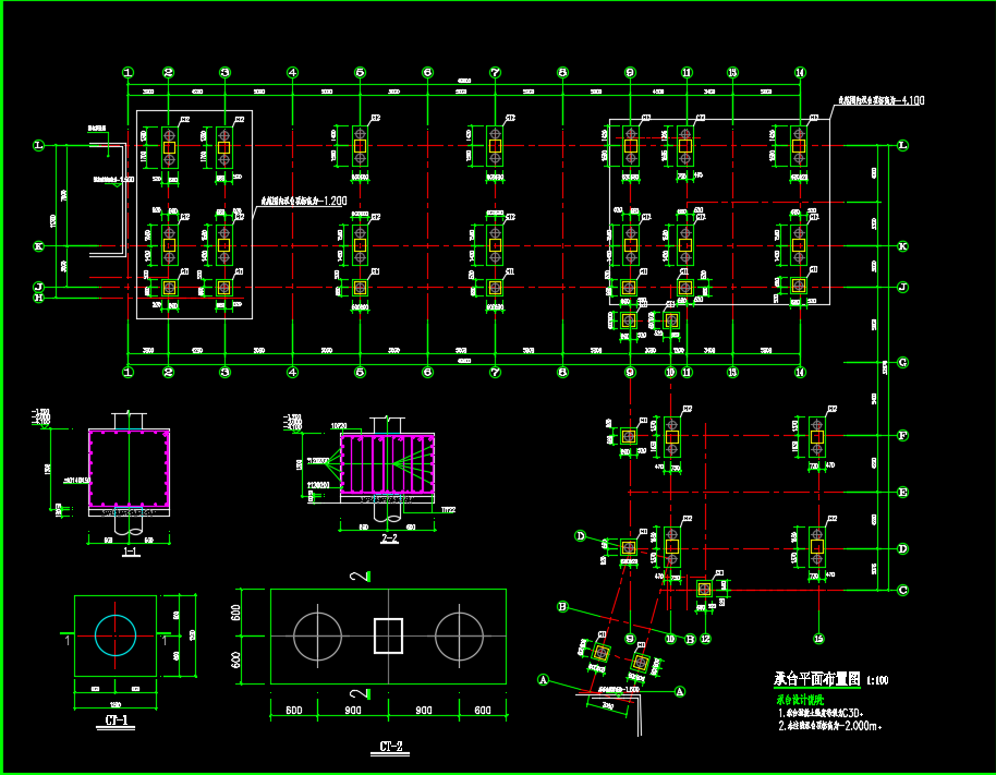 三层钢框架结构教学楼施工图包括:桩位平面布置图、承台平面布置图、基础梁平法施工图、短柱平面定位图、钢柱平面定位图、柱脚螺栓平面定位图等。