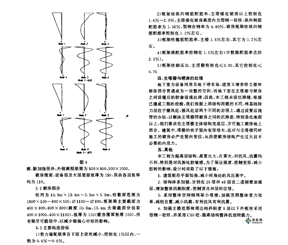 本工程是一幢 集五星级酒店 、智能 办公 、商场 、餐 饮娱 乐、健 身 等多功能于一体的大型综合性现代化超高层建筑,大厦总建 筑面 积为 85382.7m ,由来段 主接及褶 房 和西段 附接 组成 . 东西段地 下均 为 3层 ,主搂地上 48层 ,屋面 高 173.600m(局 部高度 221.500m),裙房和 附接 8层 ,檐 口高度 41.050m,