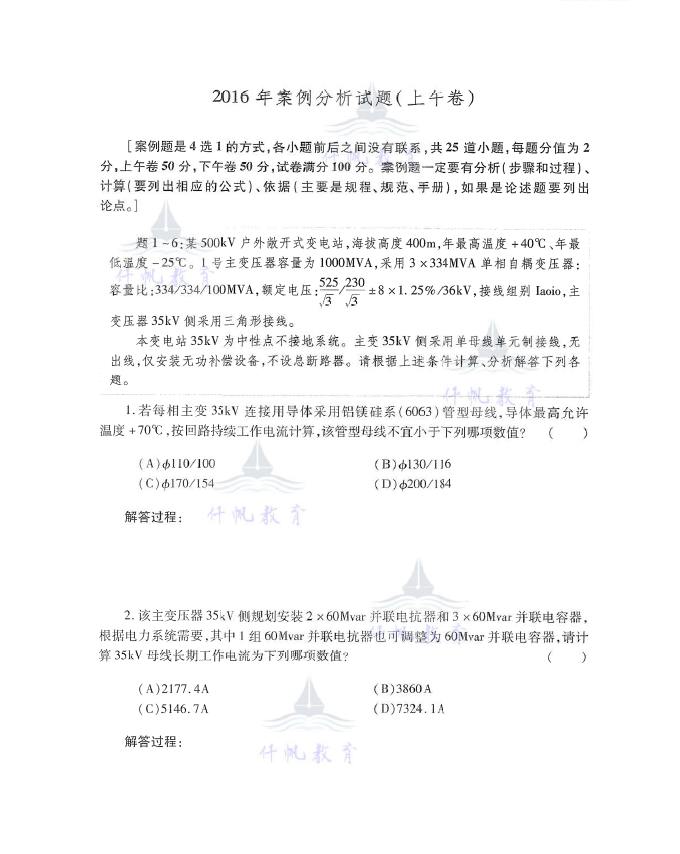 2016年发输变电专业案例真题试卷与答案(上午卷  PDF格式)