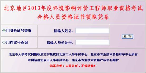 北京地区2013年度环境影响评价工程师职业资格考试合格人员资格证书领取凭条