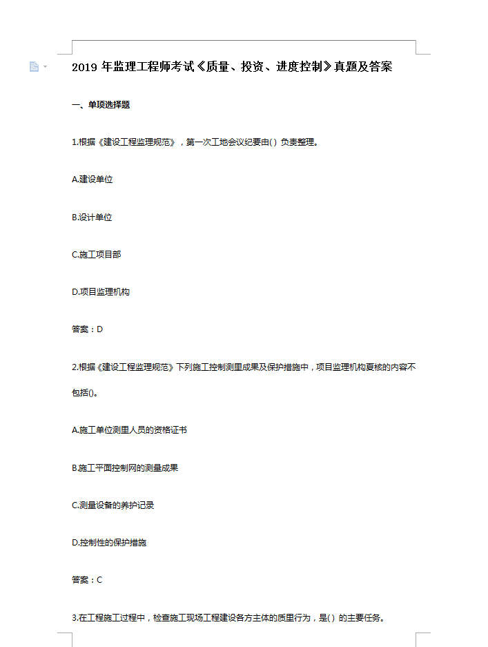 本文为2019年监理工程师《质量投资进度控制》真题及答案,供大家参考。