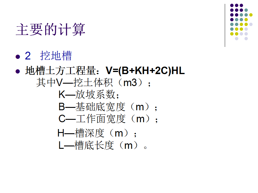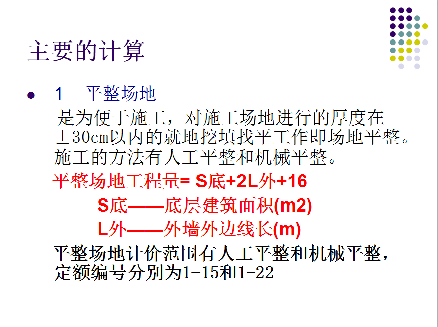 ƽÕû³¡µØ:ÊÇΪ±ãÓÚÊ©¹¤£¬¶ÔÊ©¹¤³¡µØ½øÐеĺñ¶ÈÔÚ¡À30cmÒÔÄڵľ͵ØÍÚÌîÕÒÆ½¹¤×÷¼´³¡µØÆ½Õû¡£Ê©¹¤µÄ·½·¨ÓÐÈ˹¤Æ½ÕûºÍ»úеƽÕû¡£ ƽÕû³¡µØ¹¤³ÌÁ¿= Sµ×+2LÍâ+16;Sµ×¡ª¡ªµ×²ã½¨ÖþÃæ»ý(m2) ; LÍ⡪¡ªÍâǽÍâ±ßÏß³¤(m);ƽÕû³¡µØ¼Æ¼Û·¶Î§ÓÐÈ˹¤Æ½ÕûºÍ»úеƽÕû£¬¶¨¶î±àºÅ·Ö±ðΪ1-15ºÍ1-22£¬µØ²Û³¤¶È£ºL£»Íâǽ°´ÍâǽÖÐÐÄÏß³¤¶È¼ÆË㣻