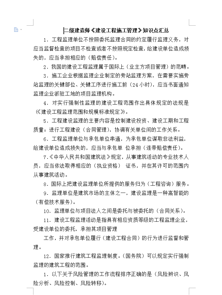 1£®¹¤³Ì¼àÀíµ¥Î»²»°´ÕÕίÍмàÀíºÏͬµÄÔ¼¶¨ÂÄÐмàÀíÒåÎñ£¬¶ÔÓ¦µ±¼à¶½¼ì²éµÄÏîÄ¿²»¼ì²é»òÕß²»°´Õչ涨¼ì²é£¬¸ø½¨É赥λÔì³ÉËðʧµÄ£¬Ó¦µ±³Ðµ£ÏàÓ¦µÄ£¨Åâ³¥ÔðÈΣ©¡£ 2£®ÎÒ¹úµÄ½¨É蹤³Ì¼àÀíÊôÓÚ¹ú¼ÊÉÏ£¨ÒµÖ÷·½ÏîÄ¿¹ÜÀí£©µÄ·¶³ë¡£ 3£®Ê©¹¤ÆóÒµ¸ù¾Ý¼àÀíÆóÒµÖÆ¶¨µÄÅÔÕ¾¼àÀí·½°¸£¬ÔÚÐèҪʵʩÅÔÕ¾¼àÀíµÄ¹Ø¼ü²¿Î»¡¢¹Ø¼ü¹¤Ðò½øÐÐÊ©¹¤Ç°£¨24Сʱ£©£¬Ó¦µ±ÊéÃæÍ¨Öª¼àÀíÆóÒµÅÉפ¹¤µØµÄÏîÄ¿¼àÀí»ú¹¹¡£ 4£®¶ÔʵÐÐÇ¿ÖÆÐÔ¼àÀíµÄ½¨É蹤³Ì·¶Î§×÷³ö¾ßÌ广¶¨µÄ·¨¹æÊÇ£¨¡¶½¨É蹤³Ì¼àÀí·¶Î§ºÍ¹æÄ£±ê×¼¹æ¶¨¡·£©¡£ 5£®¹¤³Ì½¨Éè¼àÀíµÄÖ÷ÒªÄÚÈÝÊÇ¿ØÖƽ¨ÉèͶ×Ê¡¢½¨É蹤ÆÚºÍ¹¤³ÌÖÊÁ¿£»½øÐй¤³Ì½¨É裨ºÏͬ¹ÜÀí£©£¬Ð­µ÷Óйص¥Î»¼äµÄ¹¤×÷¹ØÏµ¡£ 6£®¹¤³Ì¼àÀíµ¥Î»Óë³Ð°üµ¥Î»´®Í¨£¬Îª³Ð°üµ¥Î»Ä±È¡·Ç·¨ÀûÒæ£¬¸ø½¨É赥λÔì³ÉËðʧµÄ£¬Ó¦µ±Óë³Ð°üµ¥ λ³Ðµ££¨Á¬´øÅâ³¥ÔðÈΣ©¡£ 7£®¡¶ÖлªÈËÃñ¹²ºÍ¹ú½¨Öþ·¨¡·¹æ¶¨£¬´Óʽ¨Öþ»î¶¯µÄרҵ¼¼ÊõÈËÔ±£¬Ó¦µ±ÒÀ·¨È¡µÃÏàÓ¦µÄ£¨Ö´Òµ×ʸñ£© Ö¤Ê飬²¢ÔÚÆäÐí¿ÉµÄ·¶Î§ÄÚ´Óʽ¨Öþ»î¶¯¡£ 8£®¹ú¼ÊÉϰѽ¨Éè¼àÀíµ¥Î»ËùÌṩµÄ·þÎñ¹éΪ£¨¹¤³Ì×Éѯ£©·þÎñ¡£ 9£®¼àÀíµ¥Î»Êǽ¨ÖþÊг¡µÄÖ÷ÌåÖ®Ò»£¬½¨Éè¼àÀíÊÇÒ»ÖÖ¸ßÖÇÄܵģ¨Óг¥¼¼Êõ·þÎñ£©¡£