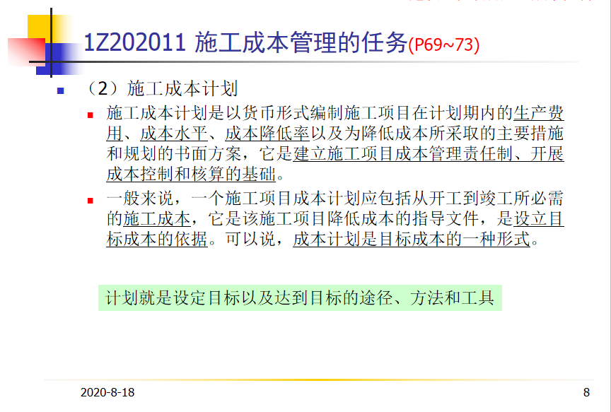 Ò»°ãÀ´Ëµ£¬Ò»¸öÊ©¹¤ÏîÄ¿³É±¾¼Æ»®Ó¦°üÀ¨´Ó¿ª¹¤µ½¿¢¹¤Ëù±ØÐèµÄÊ©¹¤³É±¾£¬ËüÊǸÃÊ©¹¤ÏîÄ¿½µµÍ³É±¾µÄÖ¸µ¼Îļþ£¬ÊÇÉèÁ¢Ä¿±ê³É±¾µÄÒÀ¾Ý¡£¿ÉÒÔ˵£¬³É±¾¼Æ»®ÊÇÄ¿±ê³É±¾µÄÒ»ÖÖÐÎʽ¡£