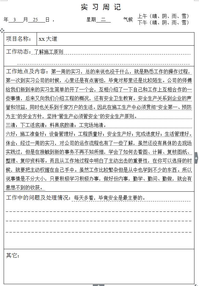 体会:经过一周的实习,对公司的运作流程也有了一些了解,虽然还没有具体的去现场实践过,但是在接触到新的事务不再不知所措,学会了如何去看图、计算、复核图纸、整理、复印资料等。而且从工作地过程中明白了主动出击的重要性,在你可以选择的时候,就要把主动权握在自己手中。虽然工作比较繁杂但是从中也学到不少的东西。所以说事情是不分大小,只要积极学习积极办事,做好份内事,勤学、勤问、勤做,就会有意想不到的收获。