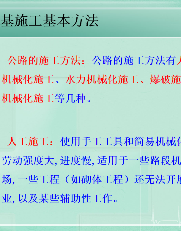 路基施工基本方法:公路的施工方法:公路的施工方法有人工和简易机械化施工、水力机械化施工、爆破施工和综合机械化施工等几种。人工施工:使用手工工具和简易机械化,效益低,劳动强度大,进度慢,适用于一些路段机械无法进场,一些工程(如砌体工程)还无法开展机械化作业,以及某些辅助性工作。