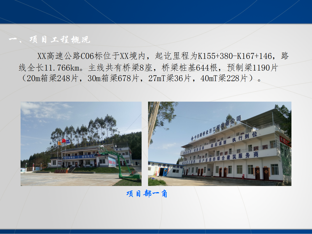 XX高速公路C06标位于XX境内,起讫里程为K155+380-K167+146,路线全长11.766km。主线共有桥梁8座,桥梁桩基644根,预制梁1190片(20m箱梁248片,30m箱梁678片,27mT梁36片,40mT梁228片)。