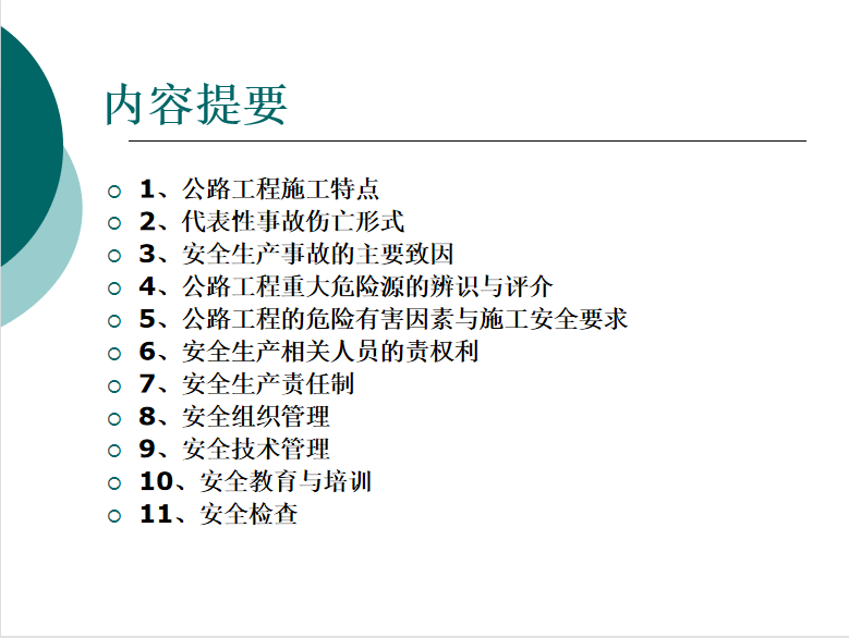 公路工程施工安全管理及安全检查内容提要:公路工程施工特点、代表性事故伤亡形式、安全生产事故的主要致因、公路工程重大危险源的辨识与评介、公路工程的危险有害因素与施工安全要求、安全生产相关人员的责权利、安全生产责任制、安全组织管理、安全技术管理、安全教育与培训、安全检查 。