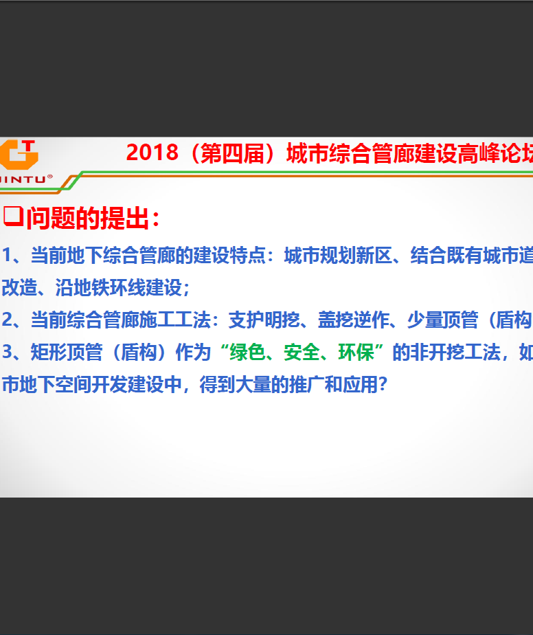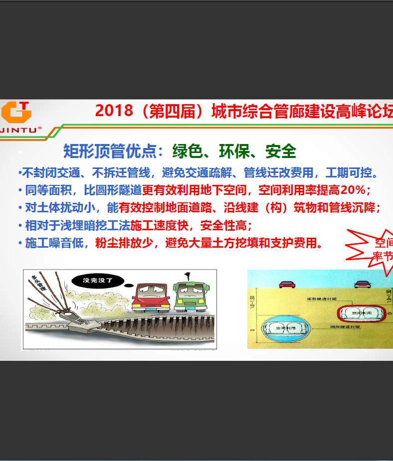 矩形顶管工法:采用 顶管机械, 顶管机械, 边切削、 边切削、 边排土、 边排土、 边顶进 边顶进将管道逐段向 前形成矩地下空间的一种 前形成矩地下空间的一种 “绿色、环保安全” 的非开挖 施工技术。