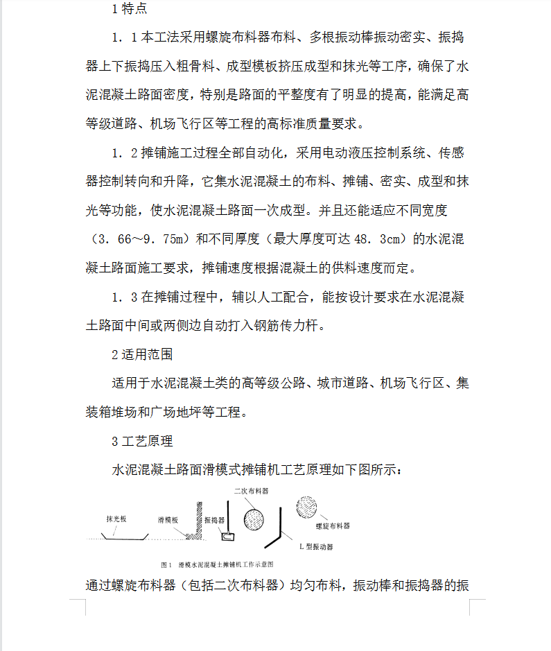 本工法采用螺旋布料器布料、多根振动棒振动密实、振捣器上下振捣压入粗骨料、成型模板挤压成型和抹光等工序,确保了水泥混凝土路面密度,特别是路面的平整度有了明显的提高,能满足高等级道路、机场飞行区等工程的高标准质量要求。