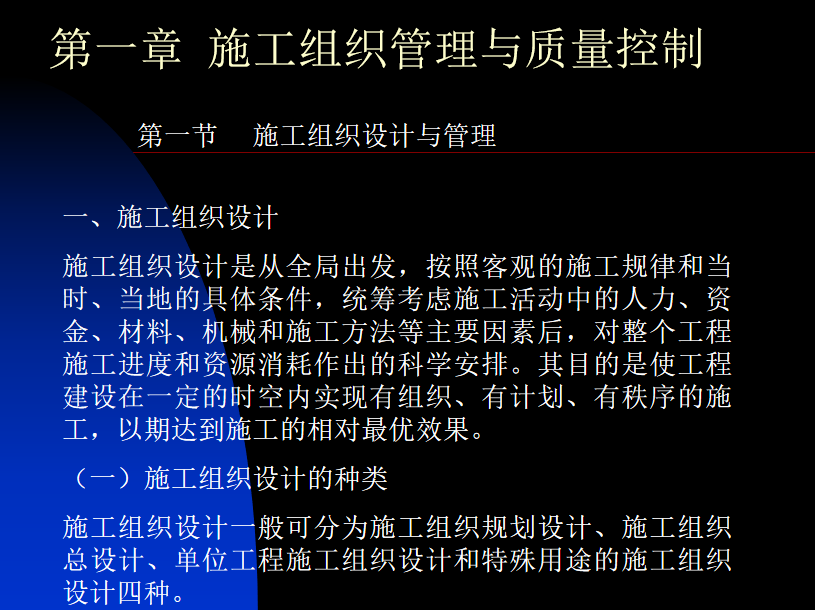 施工组织设计是从全局出发,按照客观的施工规律和当时、当地的具体条件,统筹考虑施工活动中的人力、资金、材料、机械和施工方法等主要因素后,对整个工程施工进度和资源消耗作出的科学安排。其目的是使工程建设在一定的时空内实现有组织、有计划、有秩序的施工,以期达到施工的相对最优效果。