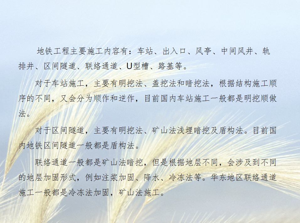 地铁工程主要施工内容有:车站、出入口、风亭、中间风井、轨排井、区间隧道、联络通道、U型槽、路基等。