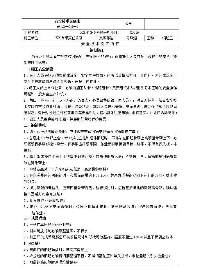 钢筋绑扎:1、绑扎底板及侧墙钢筋时,应按规定安放钢筋支架确保钢筋保护层厚度;2、在高处(2米以上含2米)绑扎立柱和墙体钢筋时,不得站在钢筋骨架上或攀登骨架上下,必须搭设脚手架或操作平台。脚手架应搭设牢固,作业面脚手板要满铺、绑牢,不得有探头板、非跳板;3、脚手架或操作平台上不得集中码放钢筋,应随使用随运送,不得将工具、箍筋或短钢筋随意放在脚手架上;4、严禁从高处向下方抛扔或从低处向高处投掷物料;5、在向竖井内运送钢筋时,必需保证吊钩下方无人,并注意调整钢筋向下运行的方向,以防撞到对撑;6、绑扎钢筋的绑丝头,应弯回至骨架内侧,暂停绑扎时,应检查所绑扎的钢筋或骨架,确认连接牢固后方可离开现场;