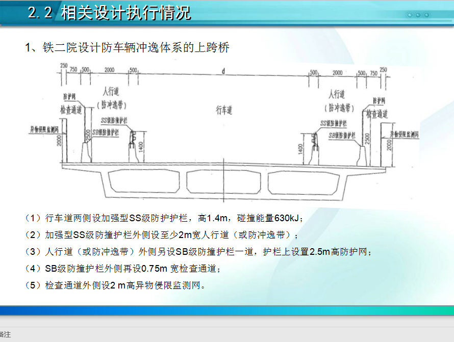 梁机动车内侧设置实体型SX防撞护栏,非机动车道再设一道SS 级防撞护栏,外侧设置0.75m检修道和竖直监测电网,SX防撞护栏顶设置总高度不低于4.0m高的防护网, SS防撞护栏顶设置总高度不低于3.5m高的防护网。