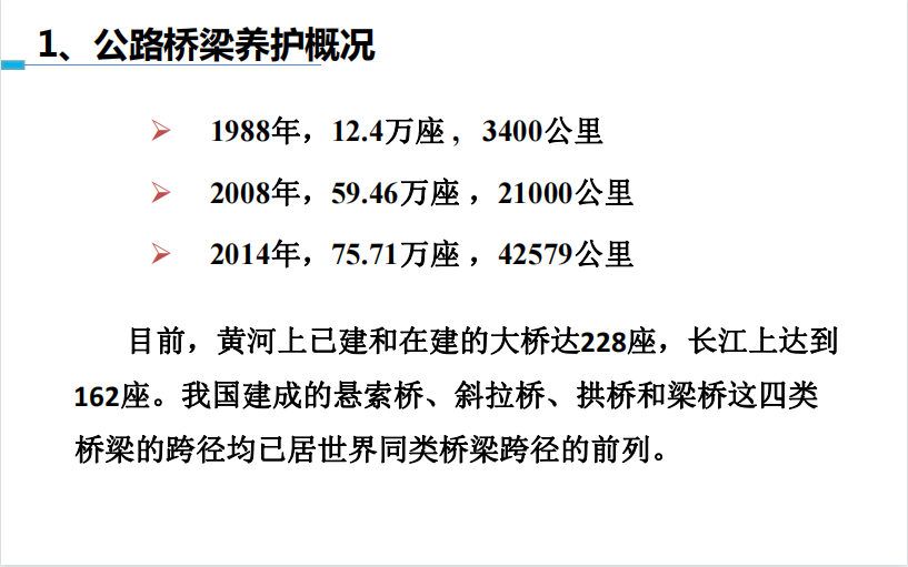 公路桥梁检测、加固技术培训的主要内容是:公路桥梁养护概况、桥梁检测与评估、桥梁检测新技术、桥梁检测典型案例、桥梁加固技术;