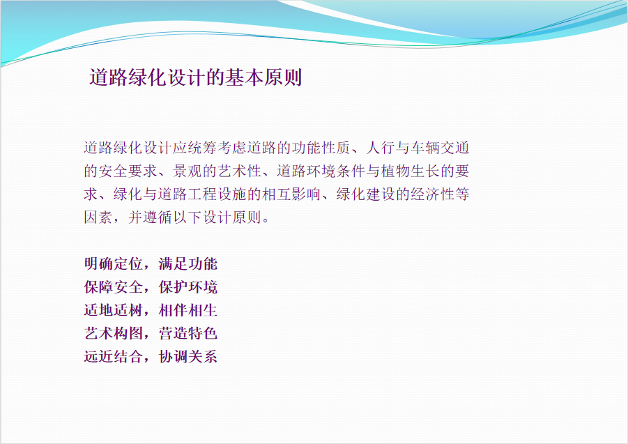 道路绿化设计应统筹考虑道路的功能性质、人行与车辆交通的安全要求、景观的艺术性、道路环境条件与植物生长的要求、绿化与道路工程设施的相互影响、绿化建设的经济性等因素,并遵循以下设计原则。