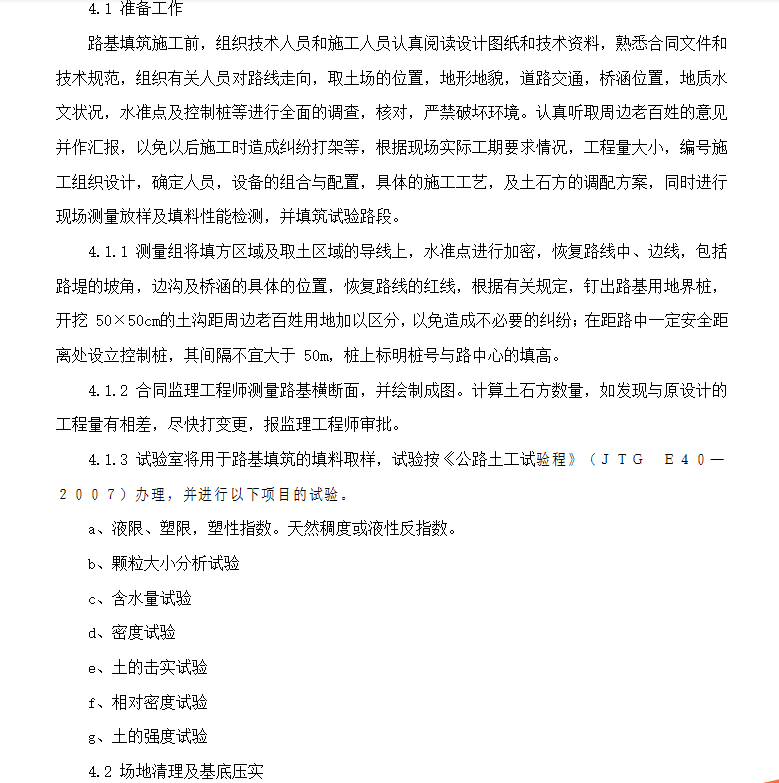 准备工作:路基填筑施工前,组织技术人员和施工人员认真阅读设计图纸和技术资料,熟悉合同文件和技术规范,组织有关人员对路线走向,取土场的位置,地形地貌,道路交通,桥涵位置,地质水文状况,水准点及控制桩等进行全面的调查,核对,严禁破坏环境。认真听取周边老百姓的意见并作汇报,以免以后施工时造成纠纷打架等,根据现场实际工期要求情况,工程量大小,编号施工组织设计,确定人员,设备的组合与配置,具体的施工工艺,及土石方的调配方案,同时进行现场测量放样及填料性能检测,并填筑试验路段。