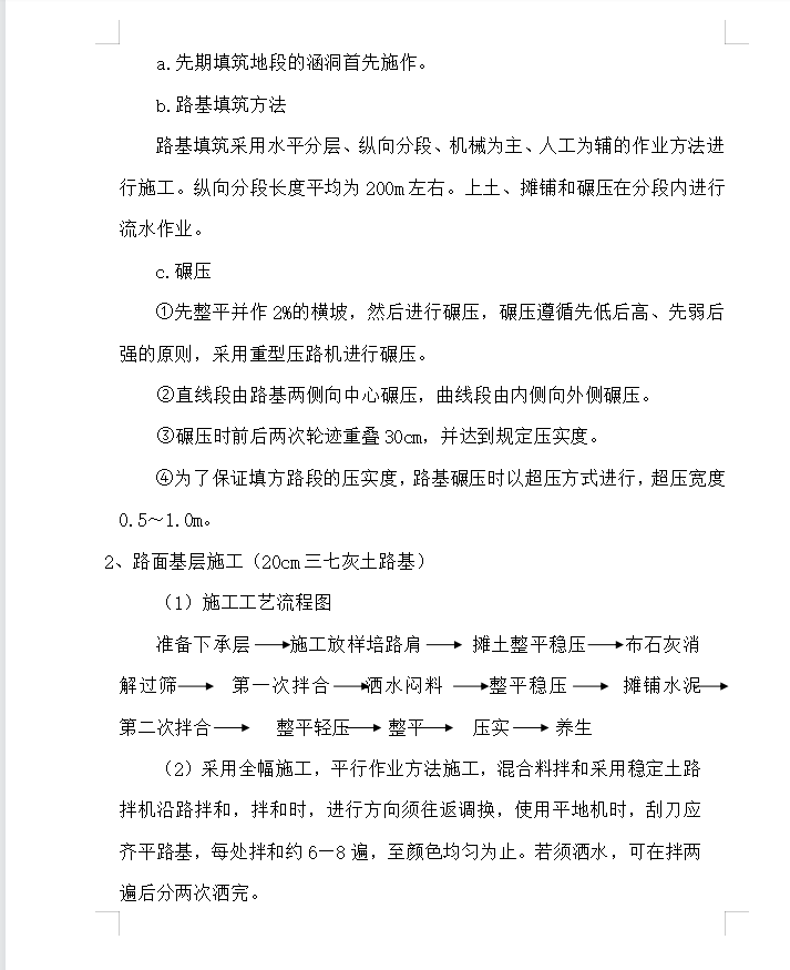 路基填筑采用水平分层、纵向分段、机械为主、人工为辅的作业方法进行施工。纵向分段长度平均为200m左右。上土、摊铺和碾压在分段内进行流水作业。