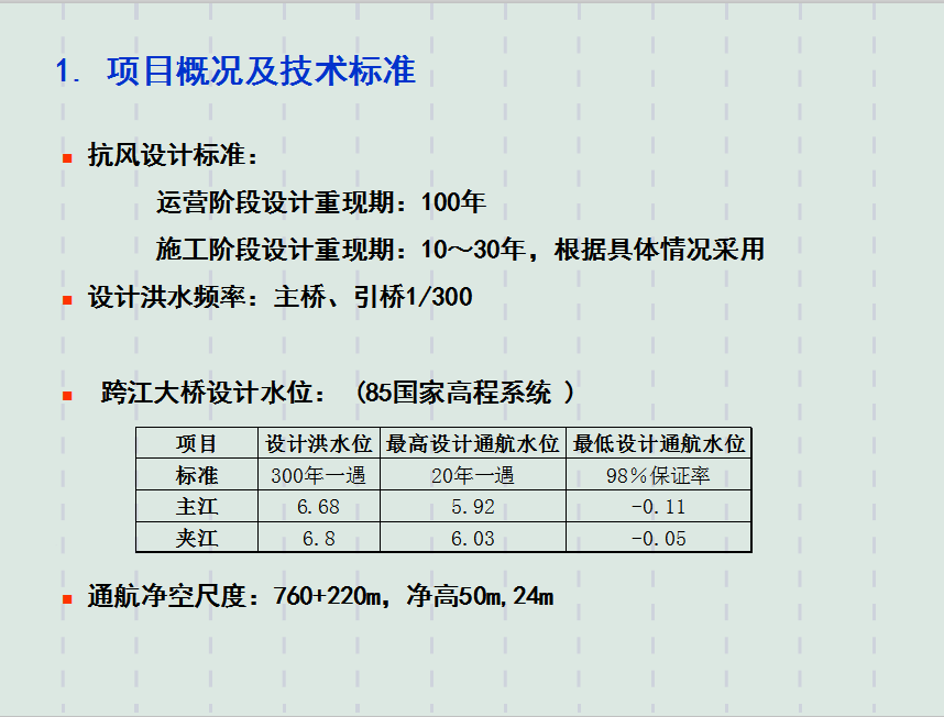 项目全长62.088km,包括主江大桥和夹江大桥及相应引桥接线工程。项目总投资93.7亿元,项目总工期为5年半。项目区域地貌上属长江三角洲冲积平原区,地势平坦开阔桥位区大部分河床面高程在-15~-20m间,深泓在右侧、最深处河床高程-30m, 2.0m高程水面线宽约2100m,左岸边坡较缓,一般在1:3,右岸的边坡较陡,接近1:2 。
