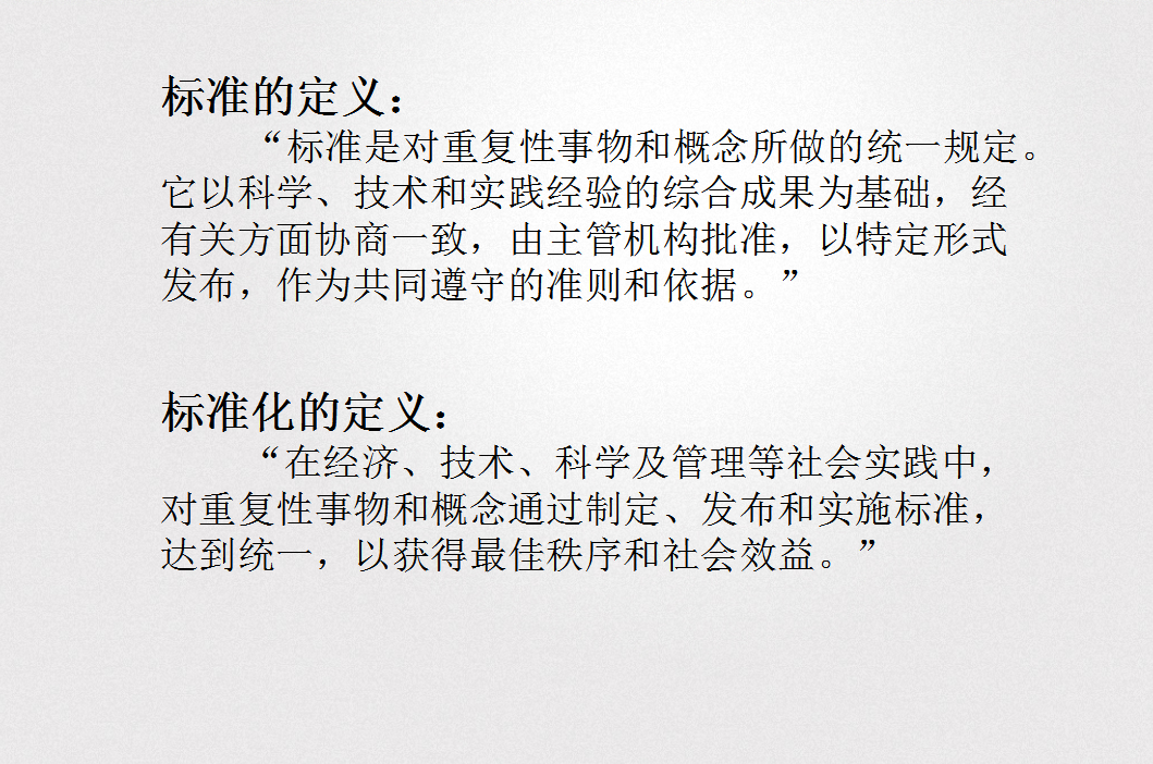 “标准是对重复性事物和概念所做的统一规定。它以科学、技术和实践经验的综合成果为基础,经有关方面协商一致,由主管机构批准,以特定形式发布,作为共同遵守的准则和依据。”