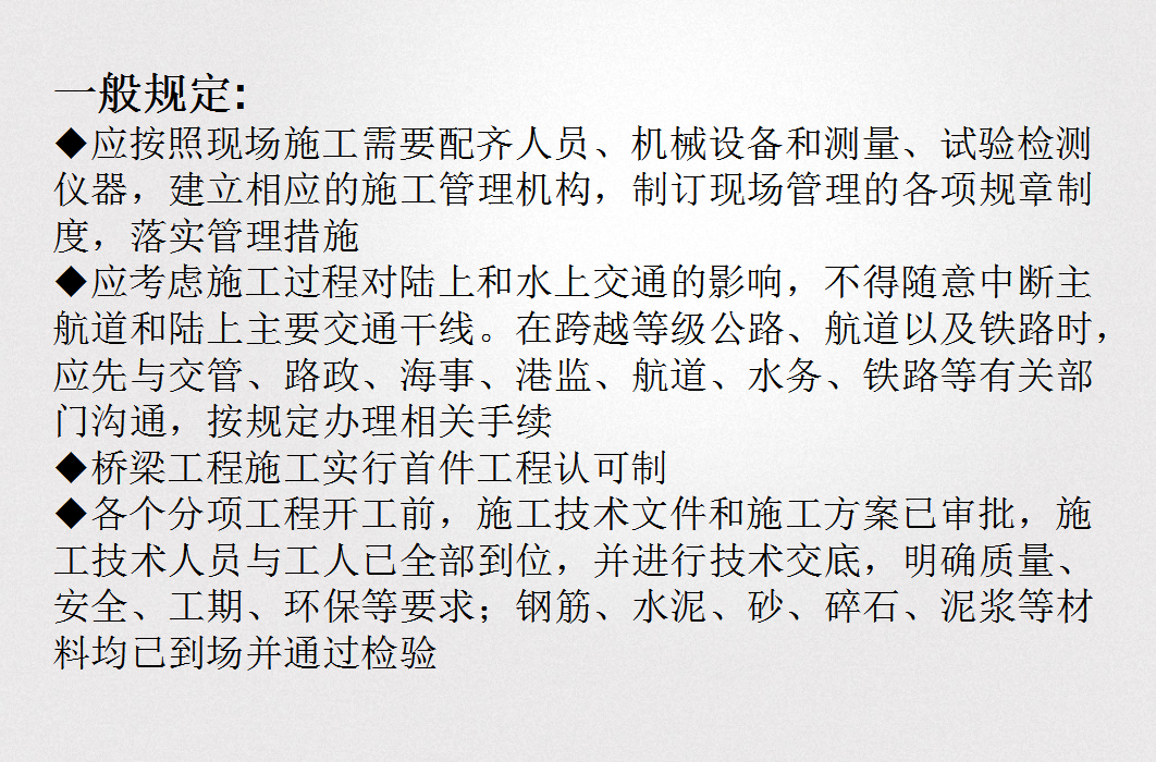 2、应考虑施工过程对陆上和水上交通的影响,不得随意中断主航道和陆上主要交通干线。在跨越等级公路、航道以及铁路时,应先与交管、路政、海事、港监、航道、水务、铁路等有关部门沟通,按规定办理相关手续