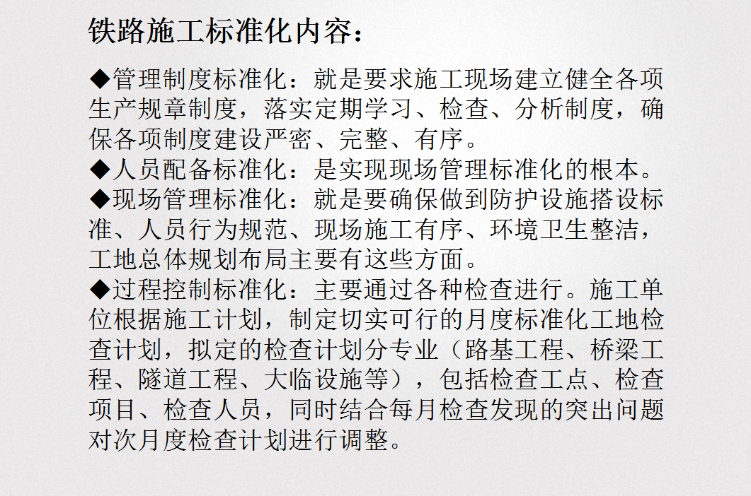 1、管理制度标准化:就是要求施工现场建立健全各项生产规章制度,落实定期学习、检查、分析制度,确保各项制度建设严密、完整、有序。