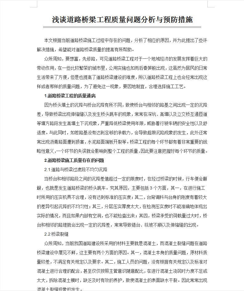 因为桥头填土的沉降与桥台沉降有所不同,致使桥台与相邻的路基之间出现一定的沉降差,导致桥梁出现伸缩缝以及发生桥头跳车的现象,常常在深坑、高填以及立交桥互通匝道等填方路段发生高填土下沉现象,严重降低桥梁使用年限,威胁着行驶车辆的安全性以及舒适度。与此同时,如若路基没有达到足够的承载力,会导致超限沉陷现象的发生,此外还常常出现沥青路面遭到损害,水泥路面端板开裂等。桥梁工程的每个环节都有着非常重要的战略性意义,一个环节的失误就会影响到整个工程的质量,因此要注意把握好每个环节的质量。