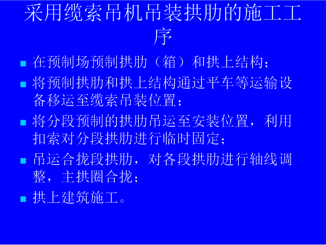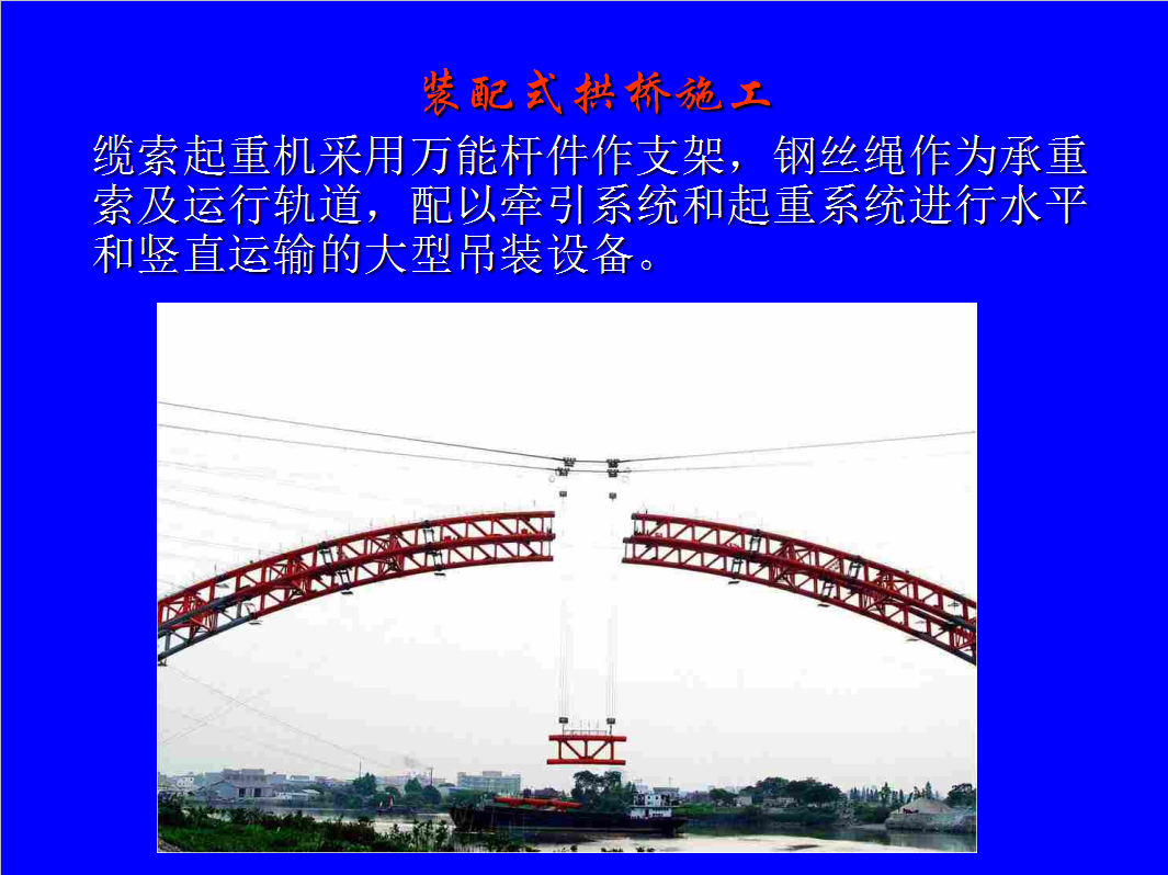 梁桥上部的轻型化、装配化,大大加快了梁桥的施工速度。适应峡谷或水深流急的河段上,或在通航的河流上需要满足船只的顺利通行,缆索吊装由于具有跨越能力大,水平和垂直运输机动灵活,适应性广。