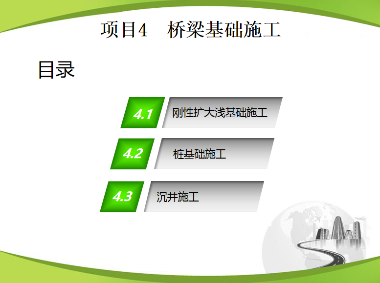 桥梁刚性扩大浅基础、桩基础及沉井施工技术的主要内容:刚性扩大浅基础施工、桩基础施工、沉井施工。