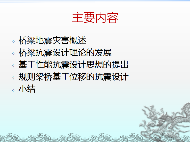 基于性能的桥梁抗震设计主要内容包括桥梁地震灾害概述、桥梁抗震设计理论的发展、基于性能抗震设计思想的提出、规则梁桥基于位移的抗震设计、小结