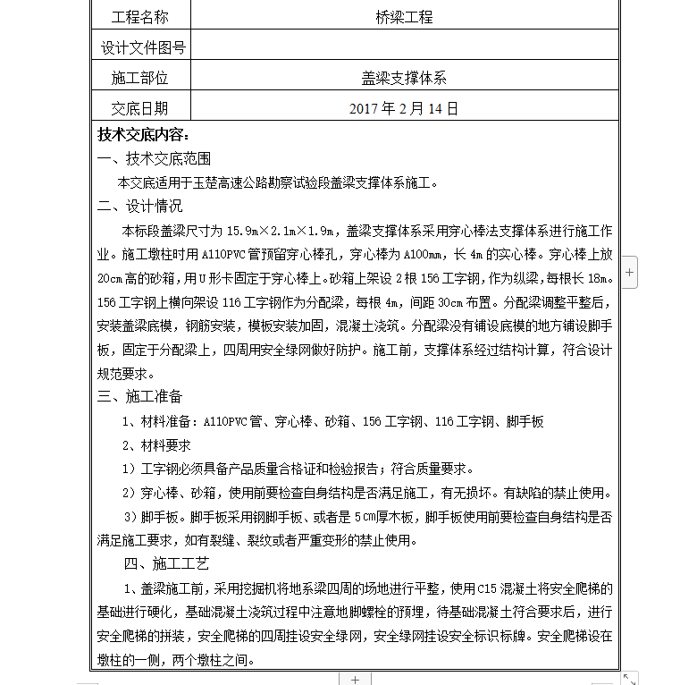 本交底适用于XX高速公路勘察试验段盖梁支撑体系施工。